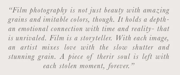 As I dive deeper into the world of film photography, I have found more and more reasons to shoot with this medium over digital. Shooting with film has made me a better artist because instead of snapping away, I am forced to be in the moment. I am more thoughtful about everything from the lighting, to the way I frame an image. I pause to consider everything, and the smallest of details are important. I know that taking these extra moments will yield a beautiful image that won't need much, if any, post production editing. I simply am investing more of myself into the process initially instead of filtering through thousands of digital images, color correcting, photoshopping and tweaking things that could have been done to begin with to make the image even more beautiful.