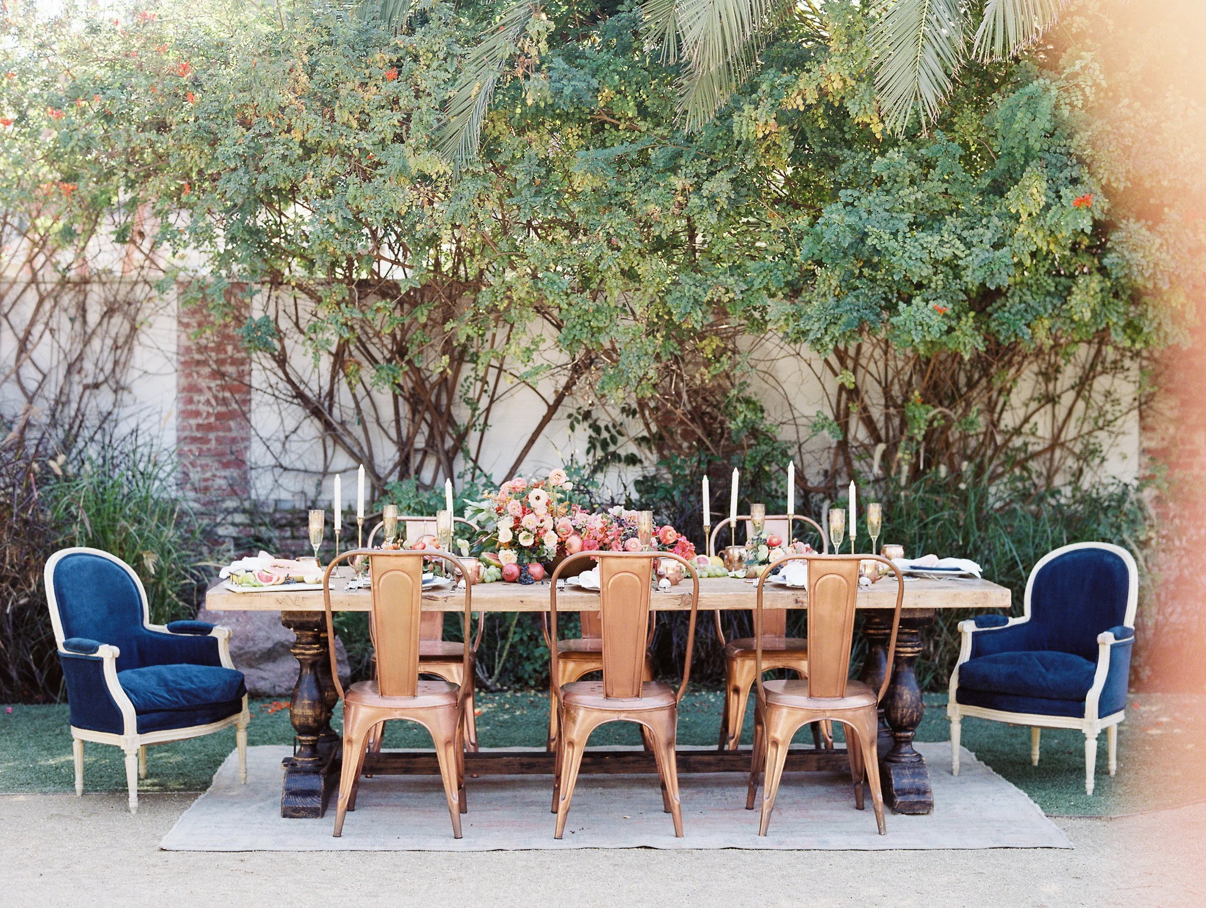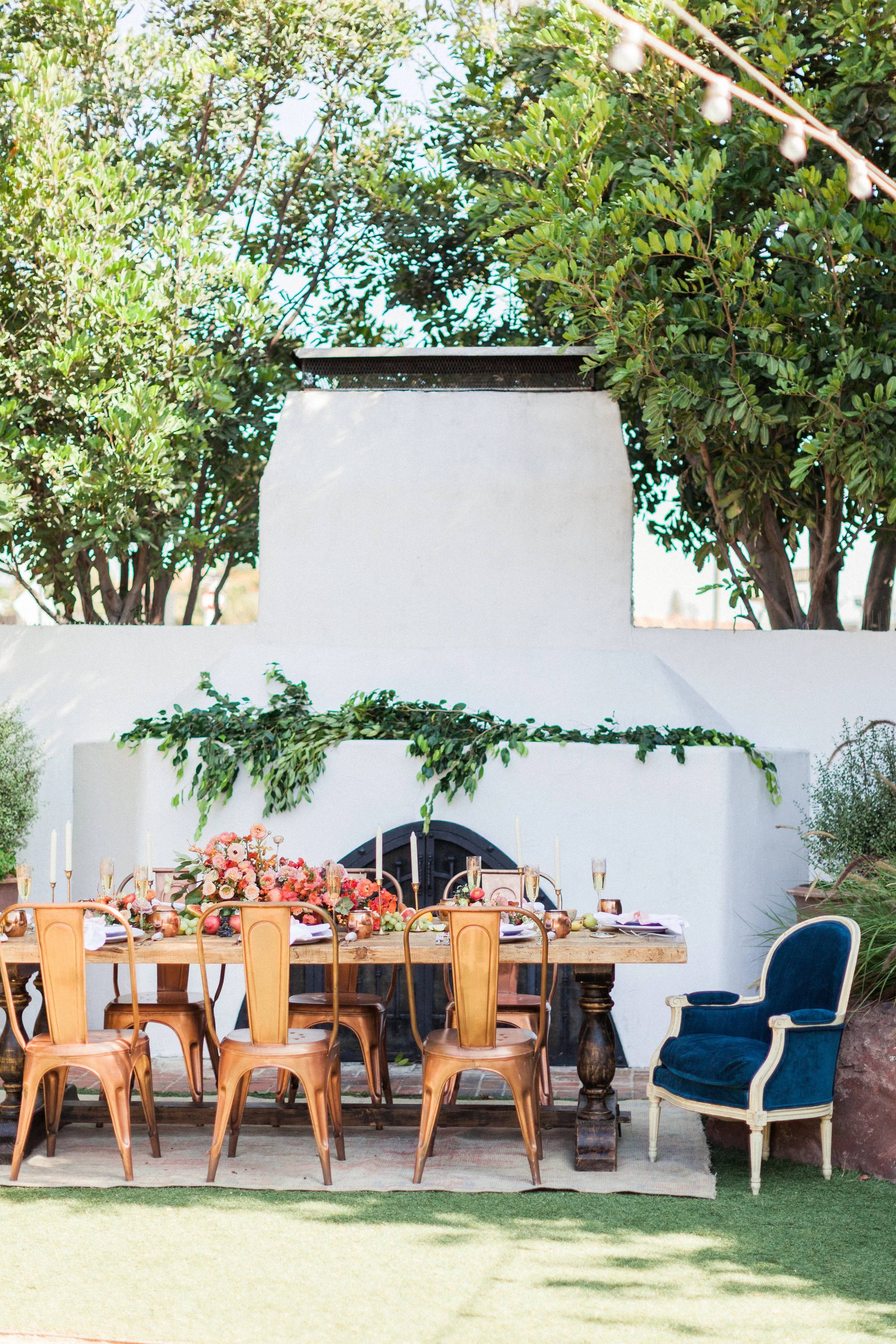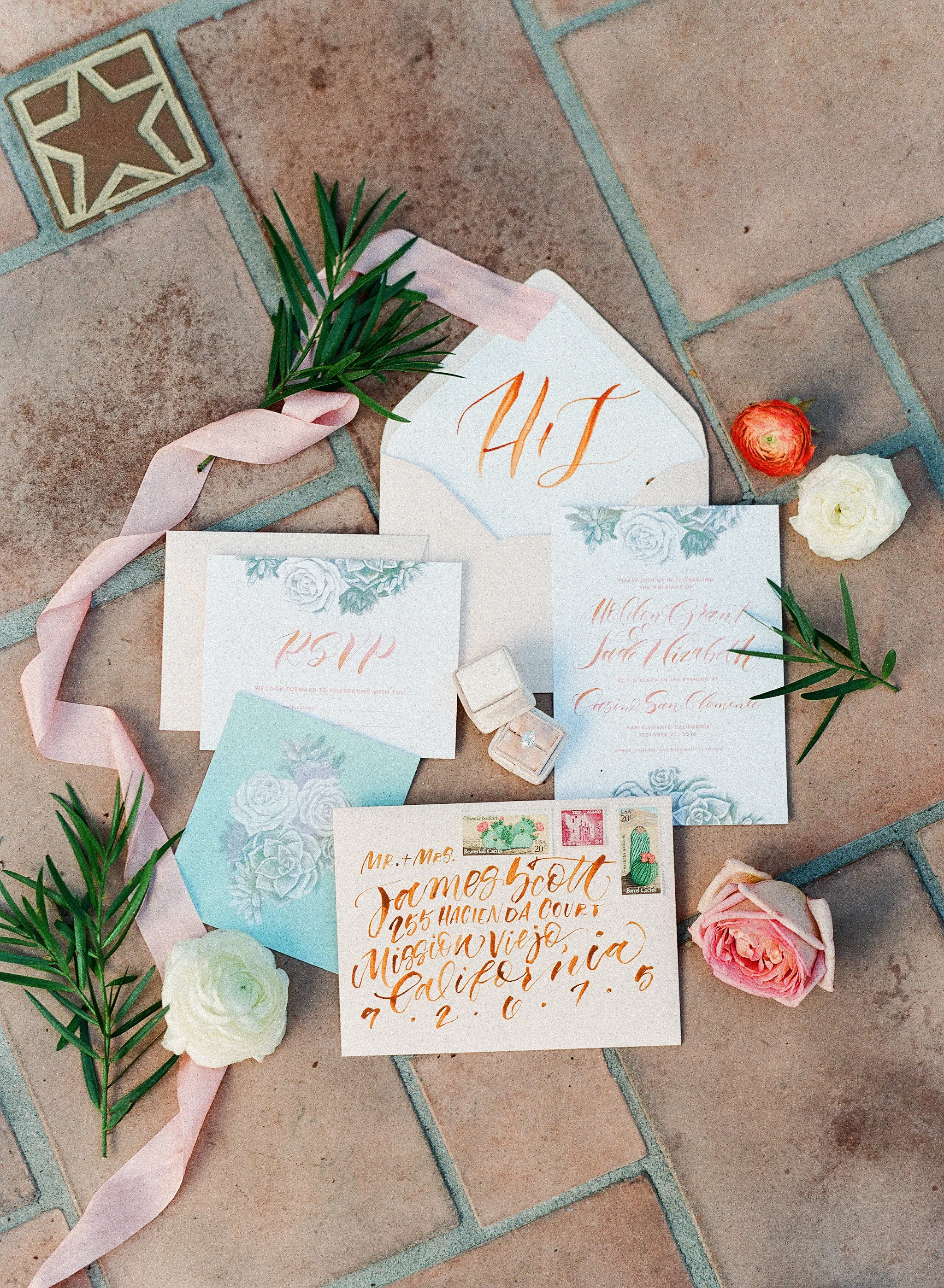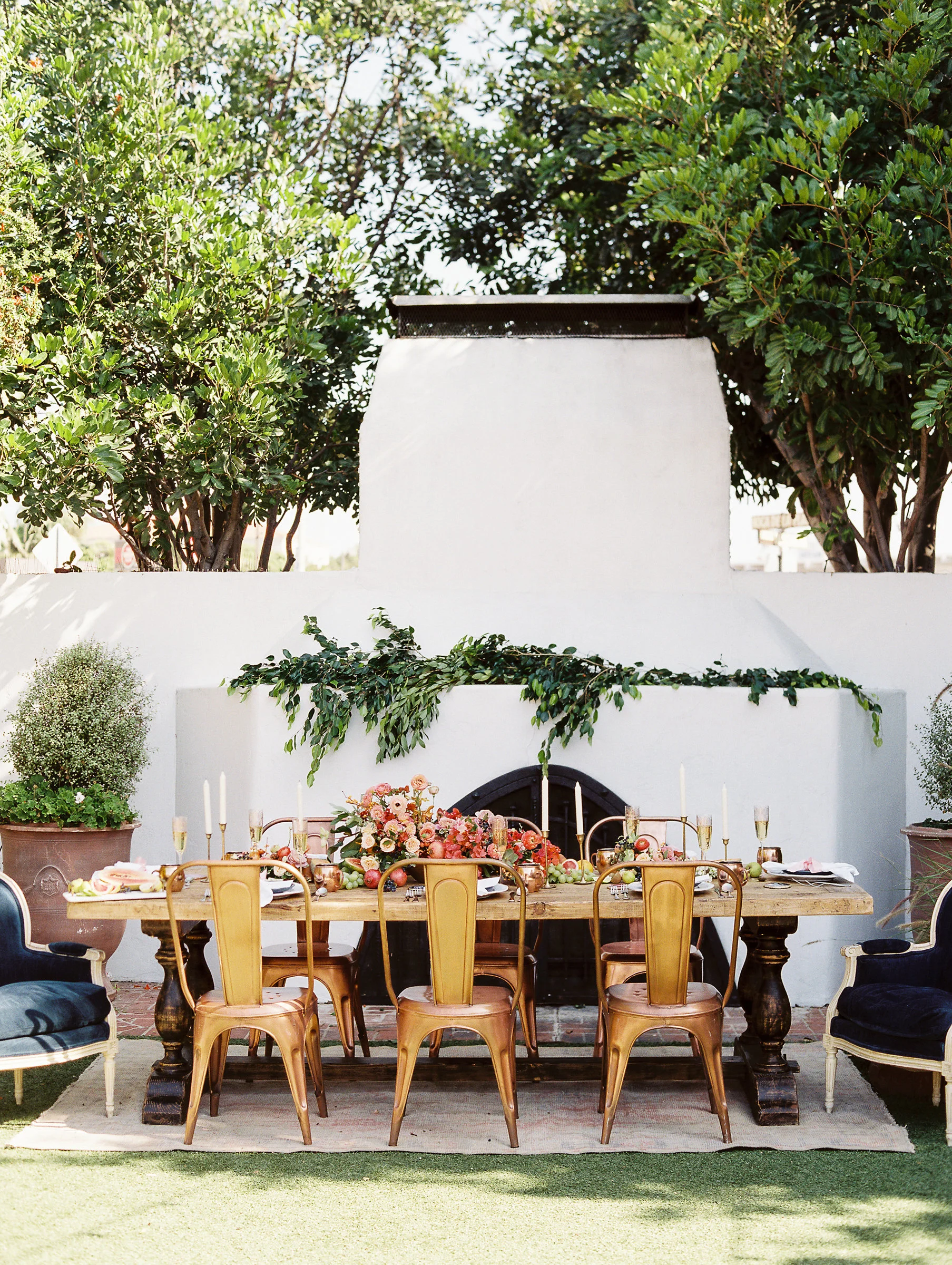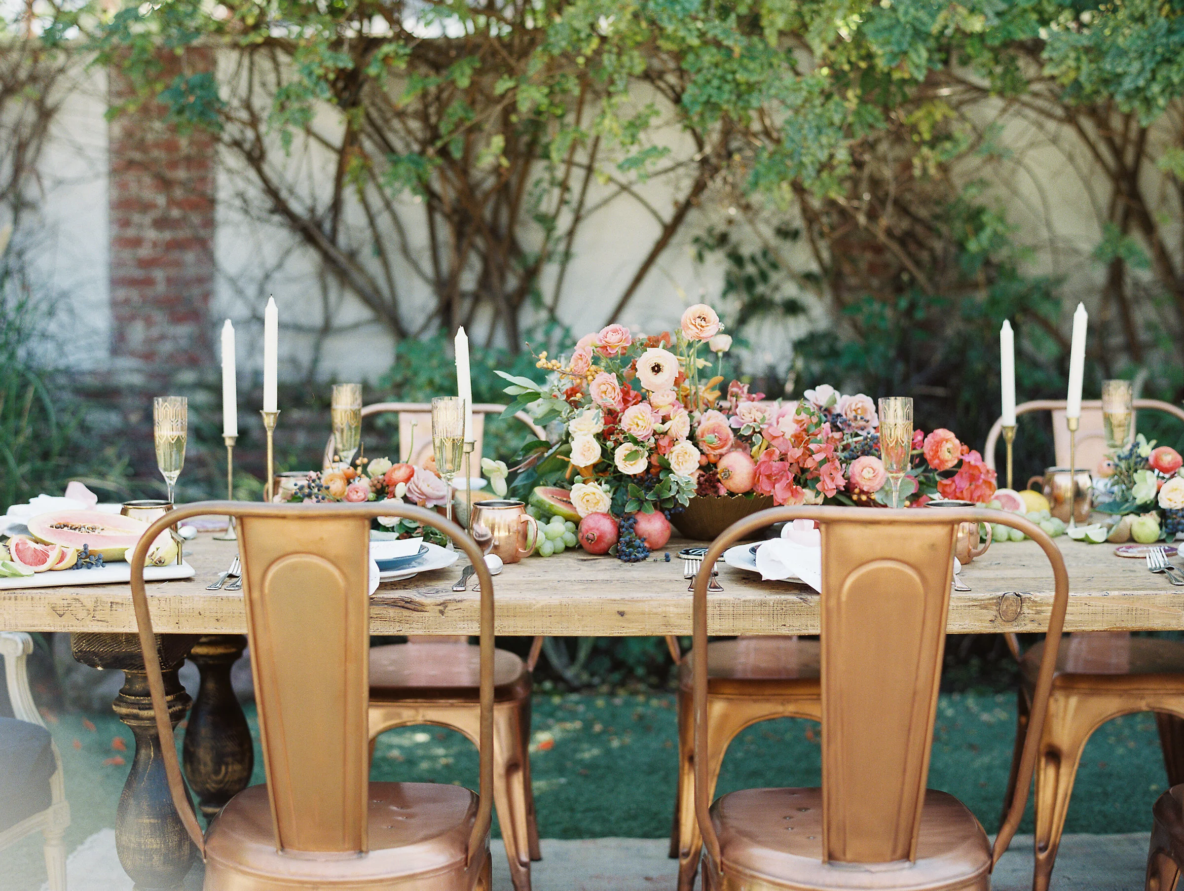 We started with rentals from Found Vintage Rentals and when we saw these metal copper chairs we had to have them. Amy Osaba brought a touch of straight up magic with her gorgeous florals and styling of the fruit spread on the table. Anthropologie champagne glasses gave a perfect touch of gold. Molly Jacques calligraphed a beautiful set of invitation suites and menus and stamps from Verde Studios accented those perfectly. Our gorgeous models wore BHLDN gowns, Susie Saltzman rings and were dolled up by Melissa of Blush by M Marie. Cakes by M Cakes Sweets made the sweet dessert bar even sweeter, and the Casino San Clemente was the backdrop for our workshop and the shoot.