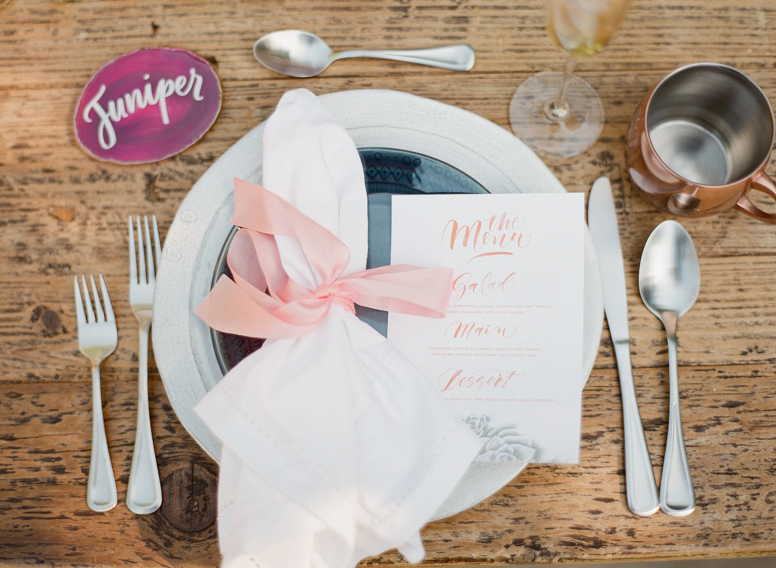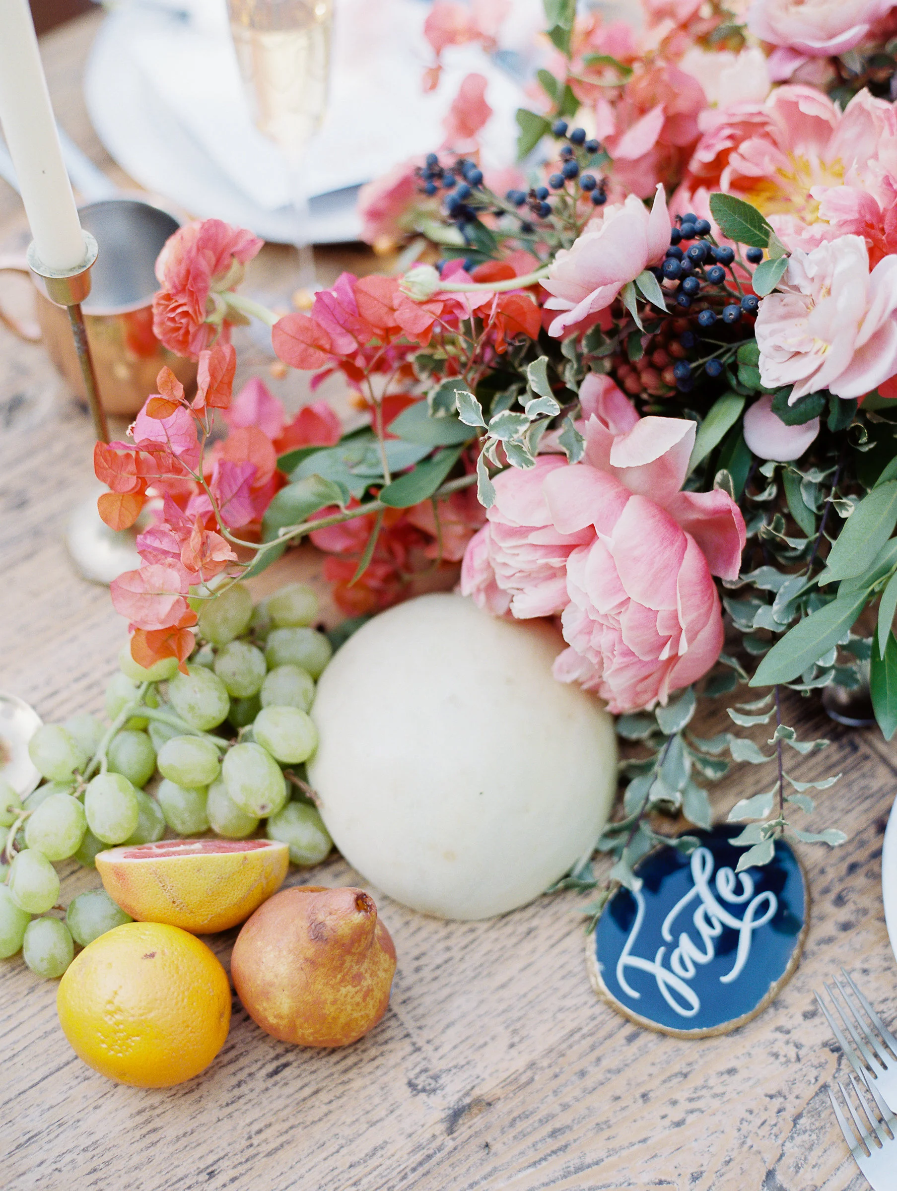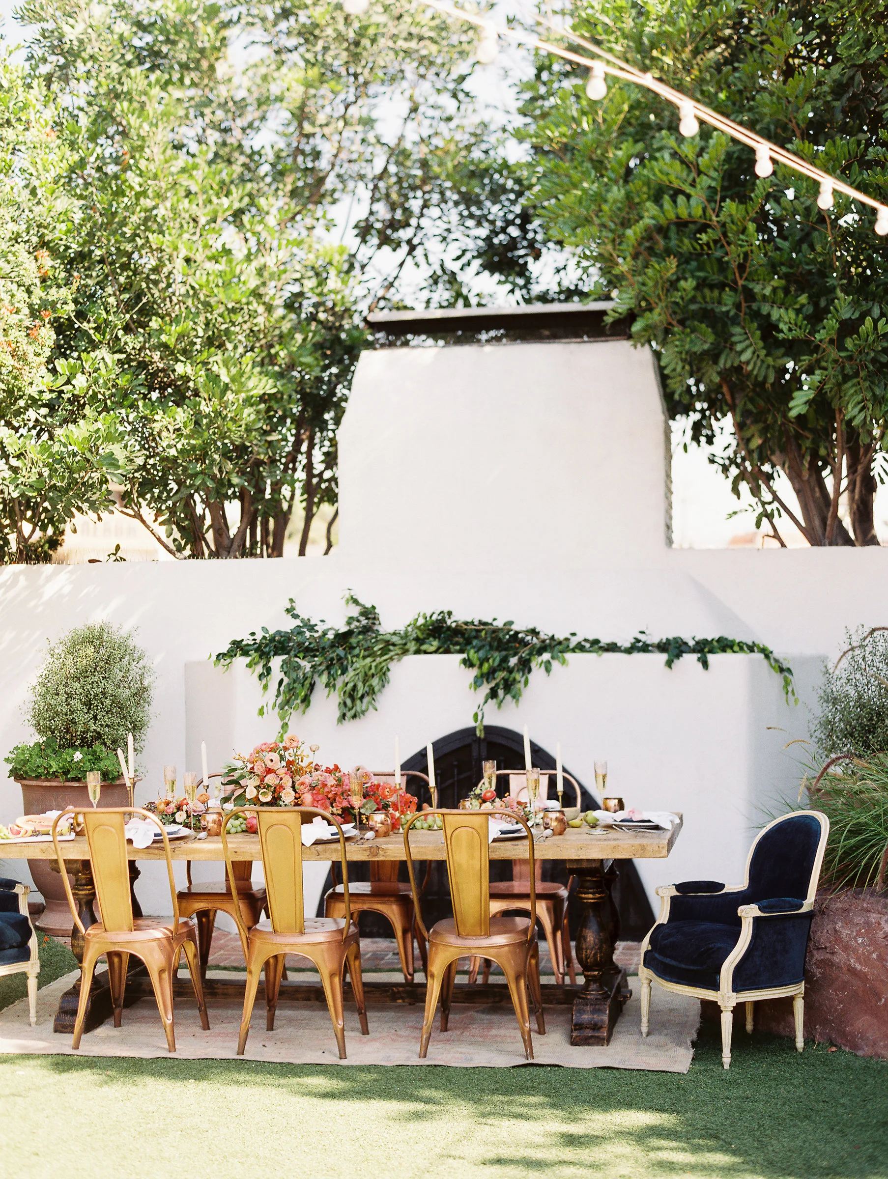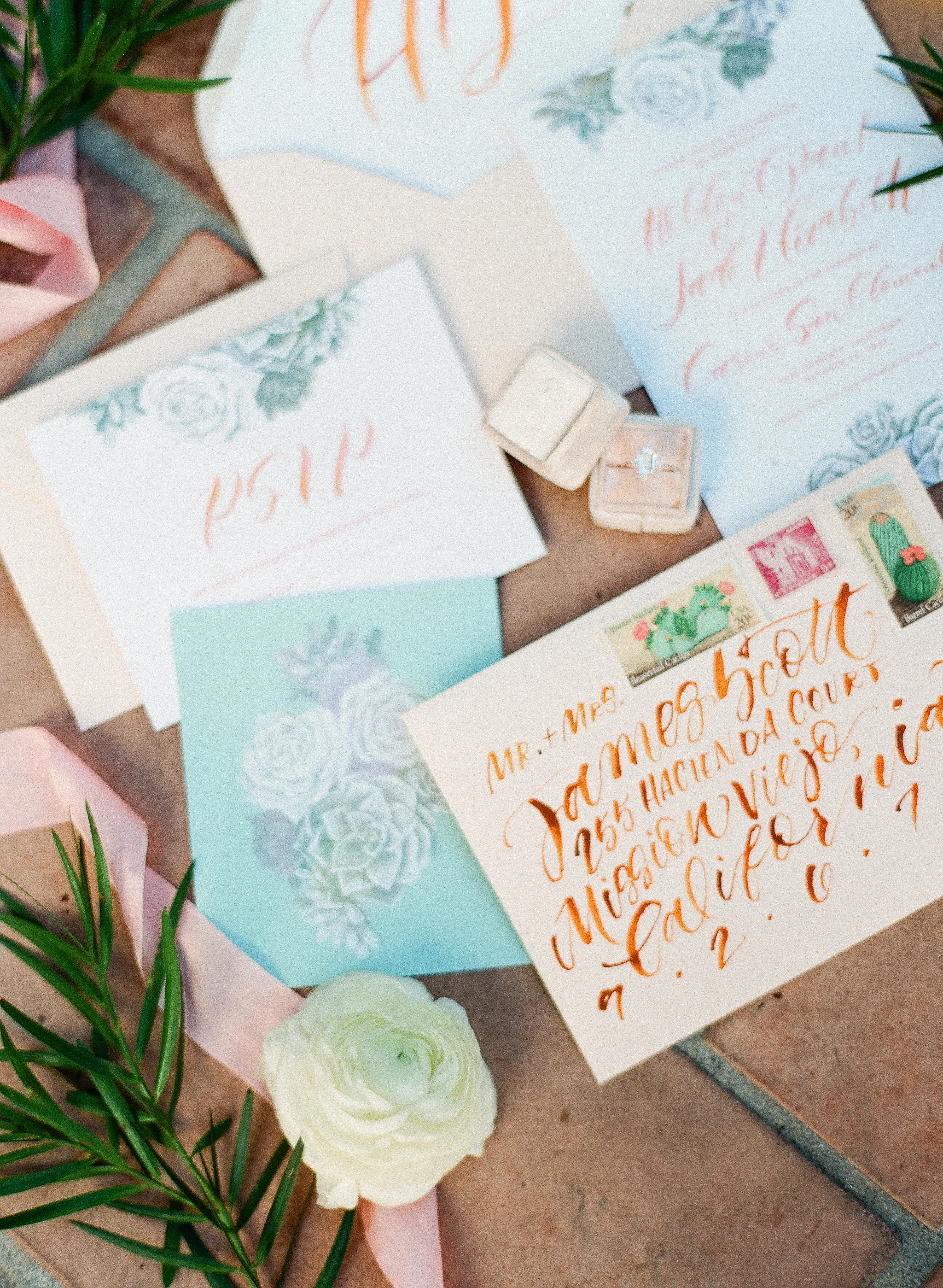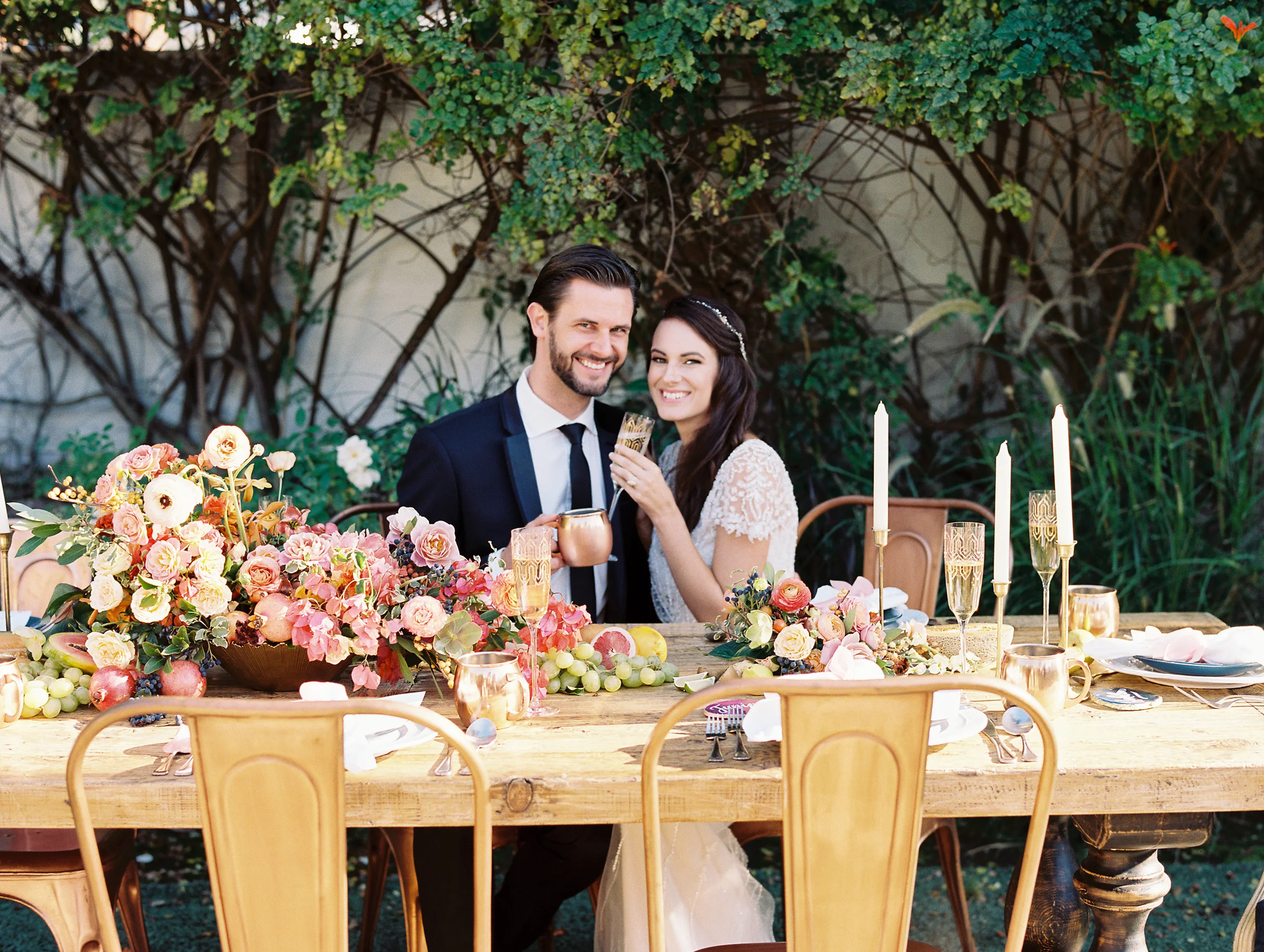 We started with rentals from Found Vintage Rentals and when we saw these metal copper chairs we had to have them. Amy Osaba brought a touch of straight up magic with her gorgeous florals and styling of the fruit spread on the table. Anthropologie champagne glasses gave a perfect touch of gold. Molly Jacques calligraphed a beautiful set of invitation suites and menus and stamps from Verde Studios accented those perfectly. Our gorgeous models wore BHLDN gowns, Susie Saltzman rings and were dolled up by Melissa of Blush by M Marie. Cakes by M Cakes Sweets made the sweet dessert bar even sweeter, and the Casino San Clemente was the backdrop for our workshop and the shoot.