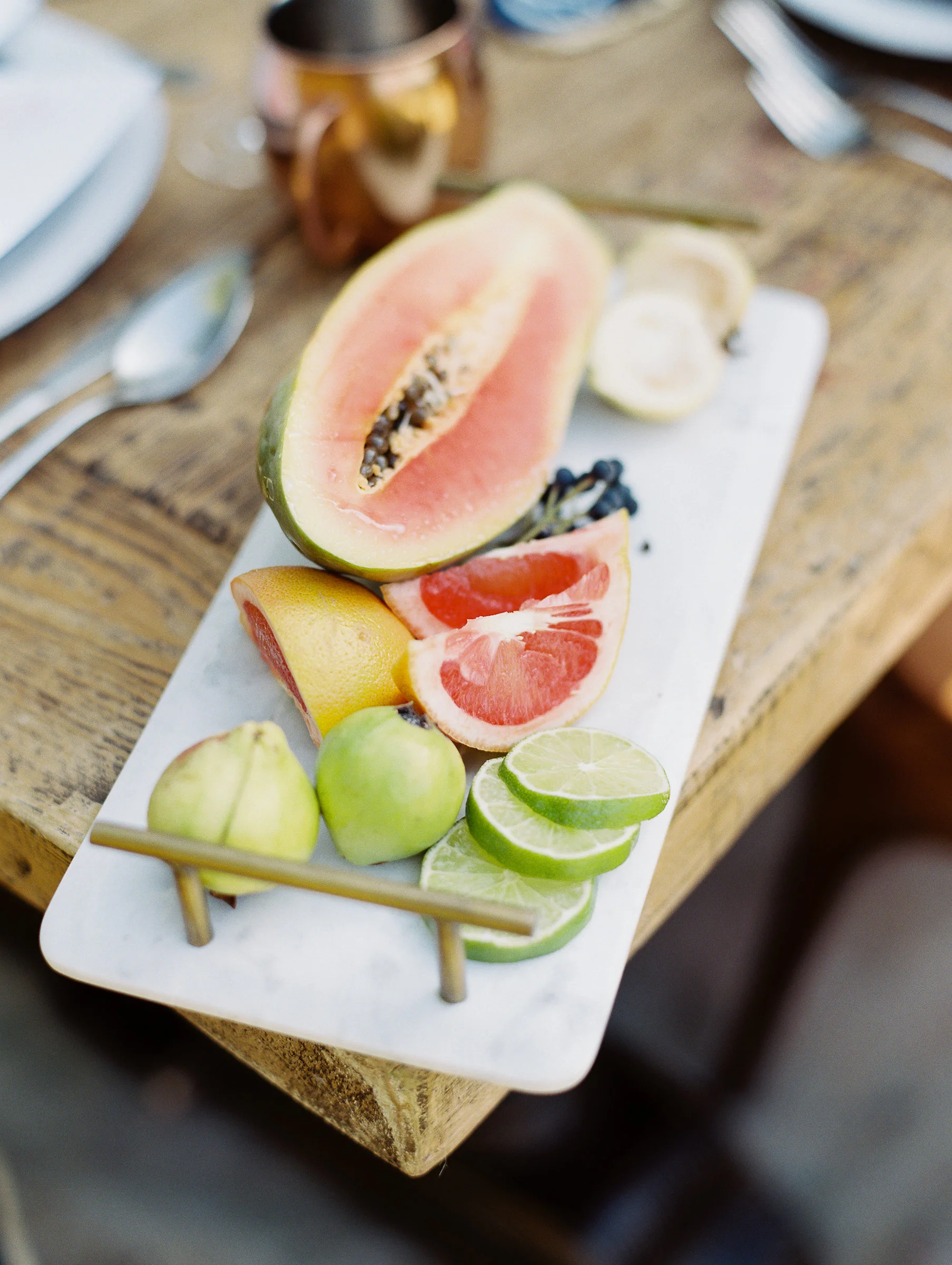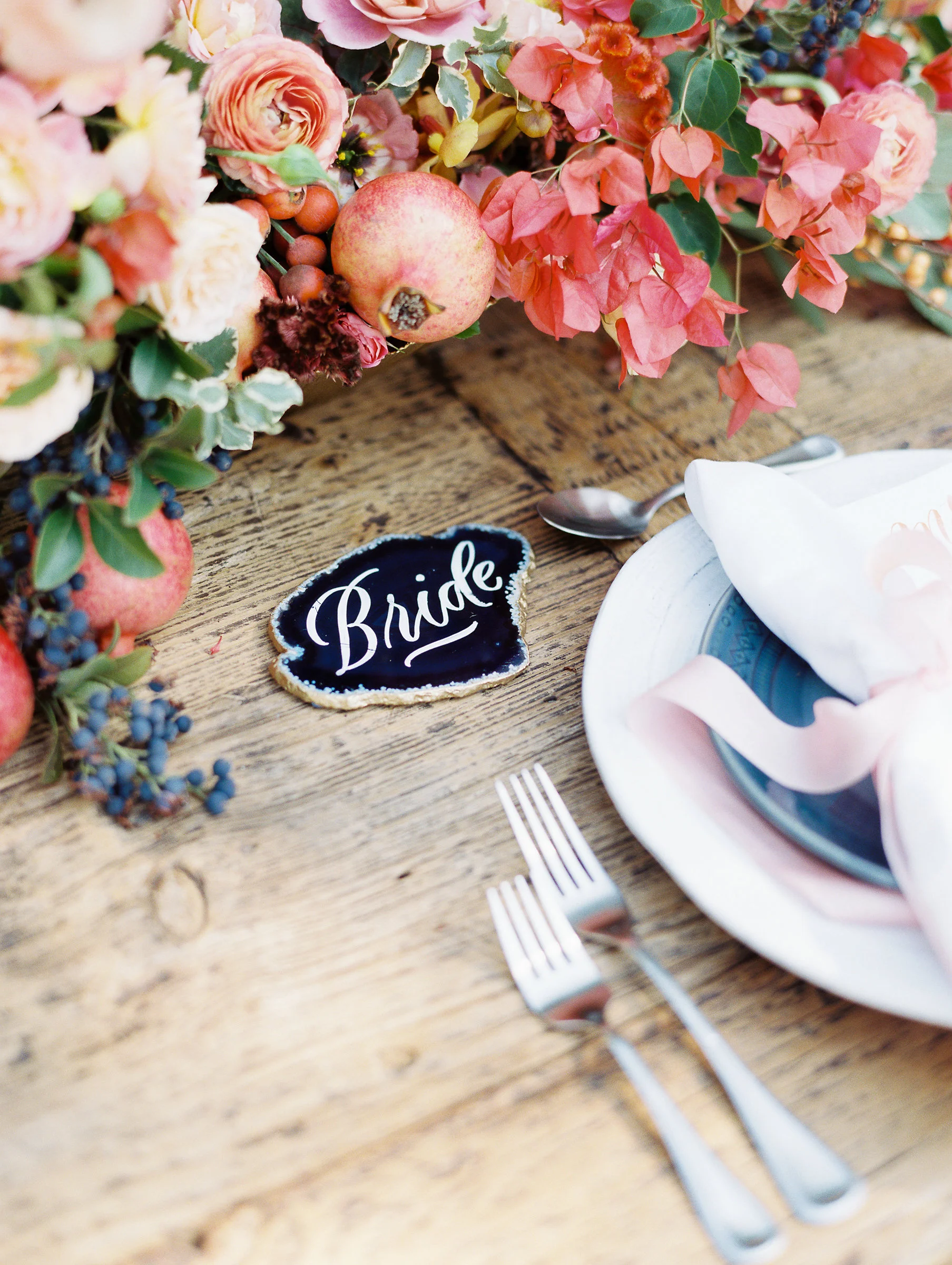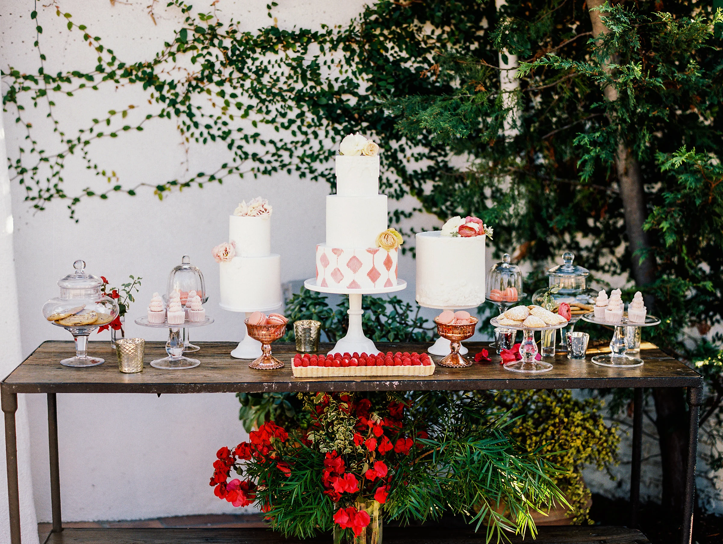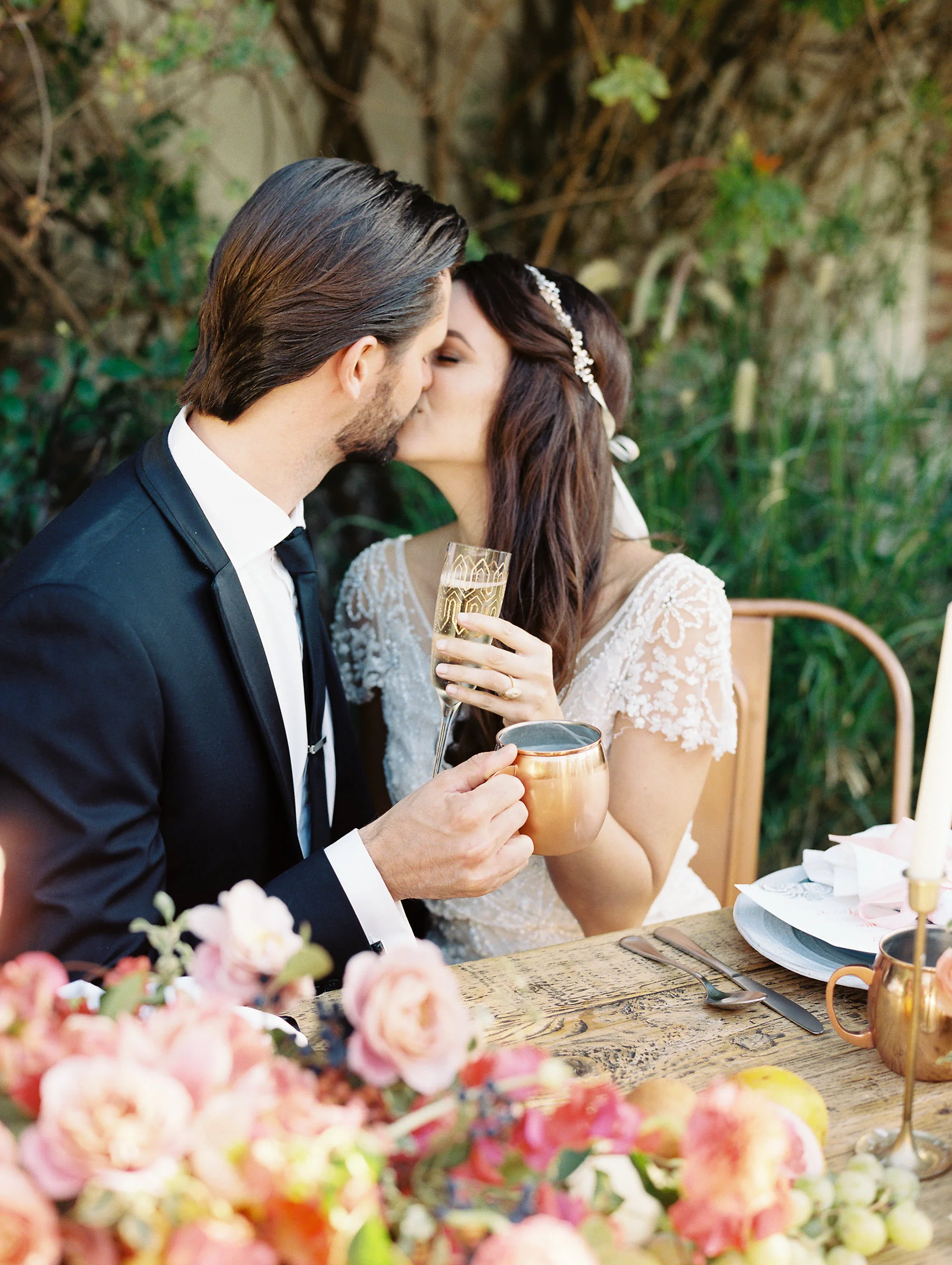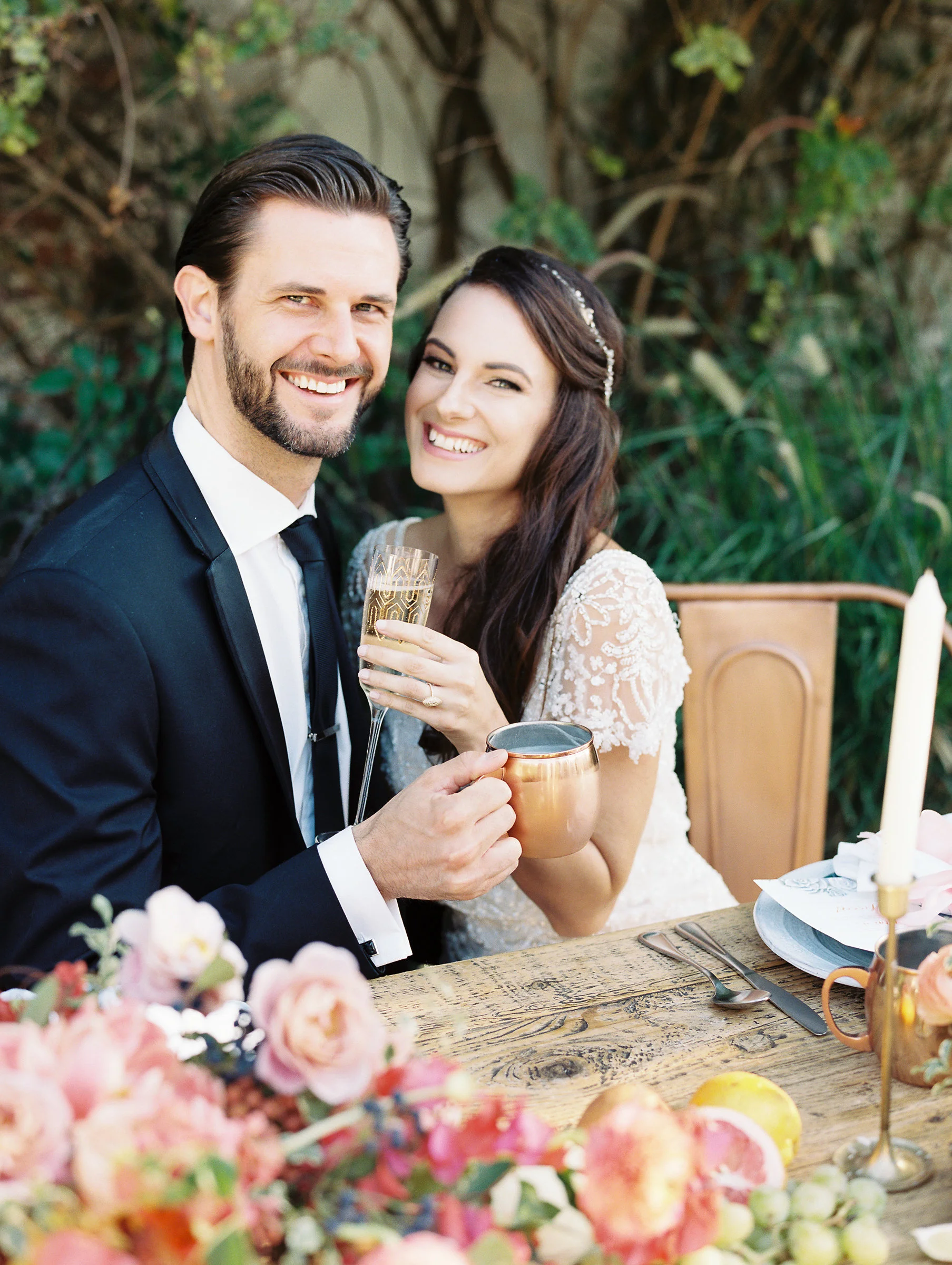 We started with rentals from Found Vintage Rentals and when we saw these metal copper chairs we had to have them. Amy Osaba brought a touch of straight up magic with her gorgeous florals and styling of the fruit spread on the table. Anthropologie champagne glasses gave a perfect touch of gold. Molly Jacques calligraphed a beautiful set of invitation suites and menus and stamps from Verde Studios accented those perfectly. Our gorgeous models wore BHLDN gowns, Susie Saltzman rings and were dolled up by Melissa of Blush by M Marie. Cakes by M Cakes Sweets made the sweet dessert bar even sweeter, and the Casino San Clemente was the backdrop for our workshop and the shoot.