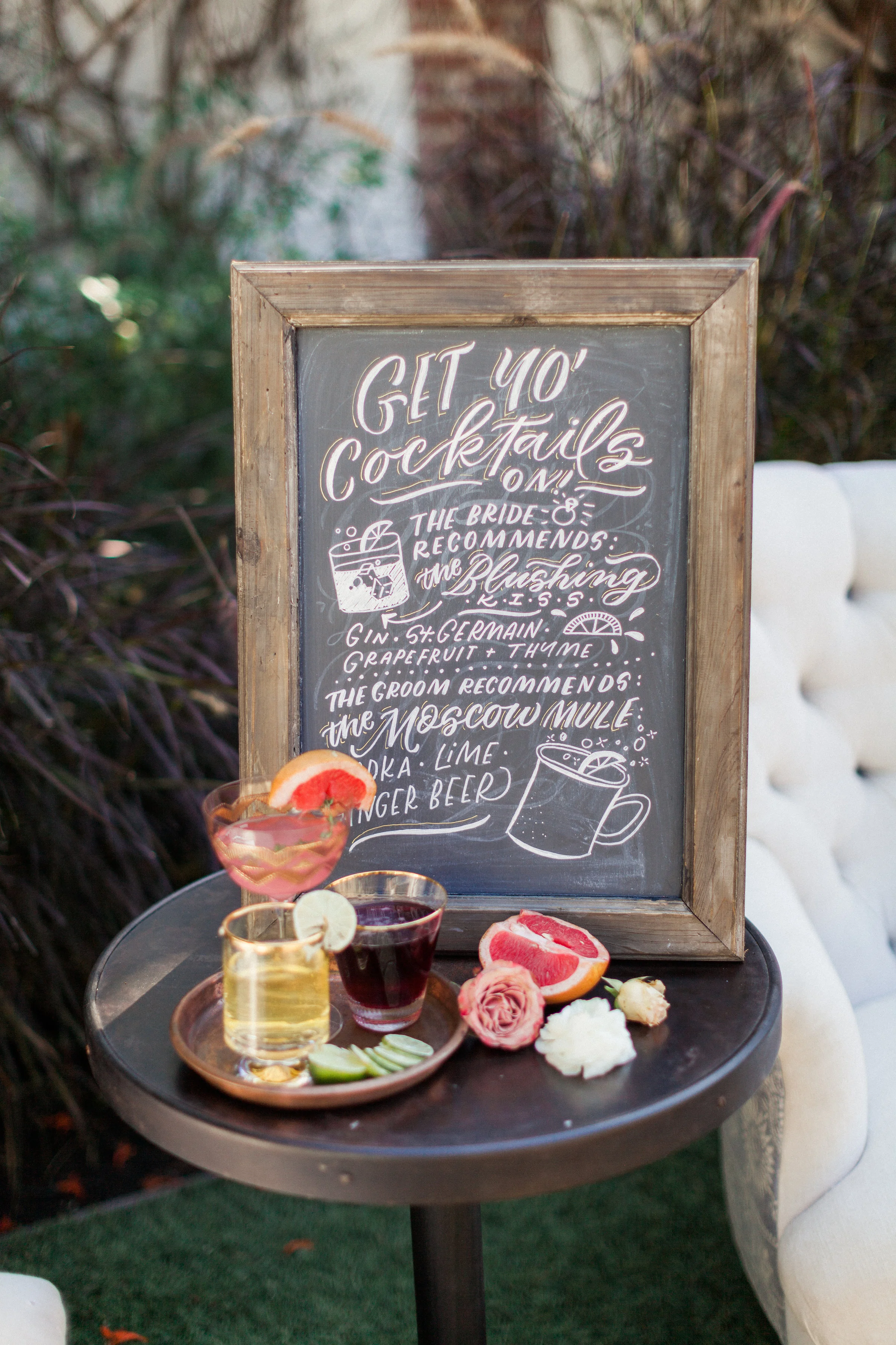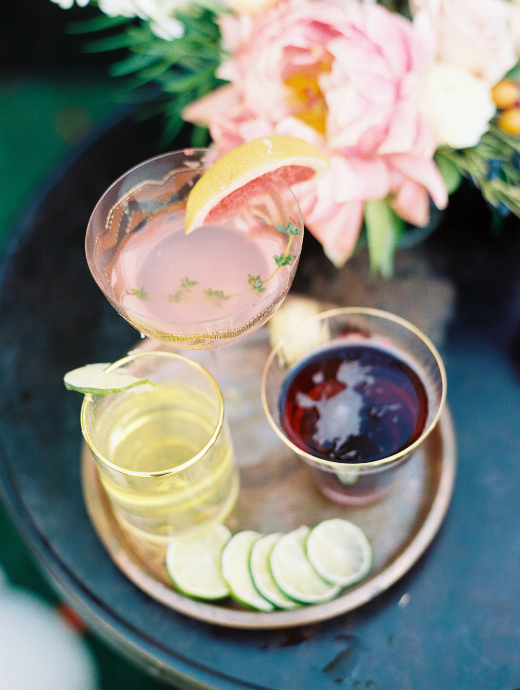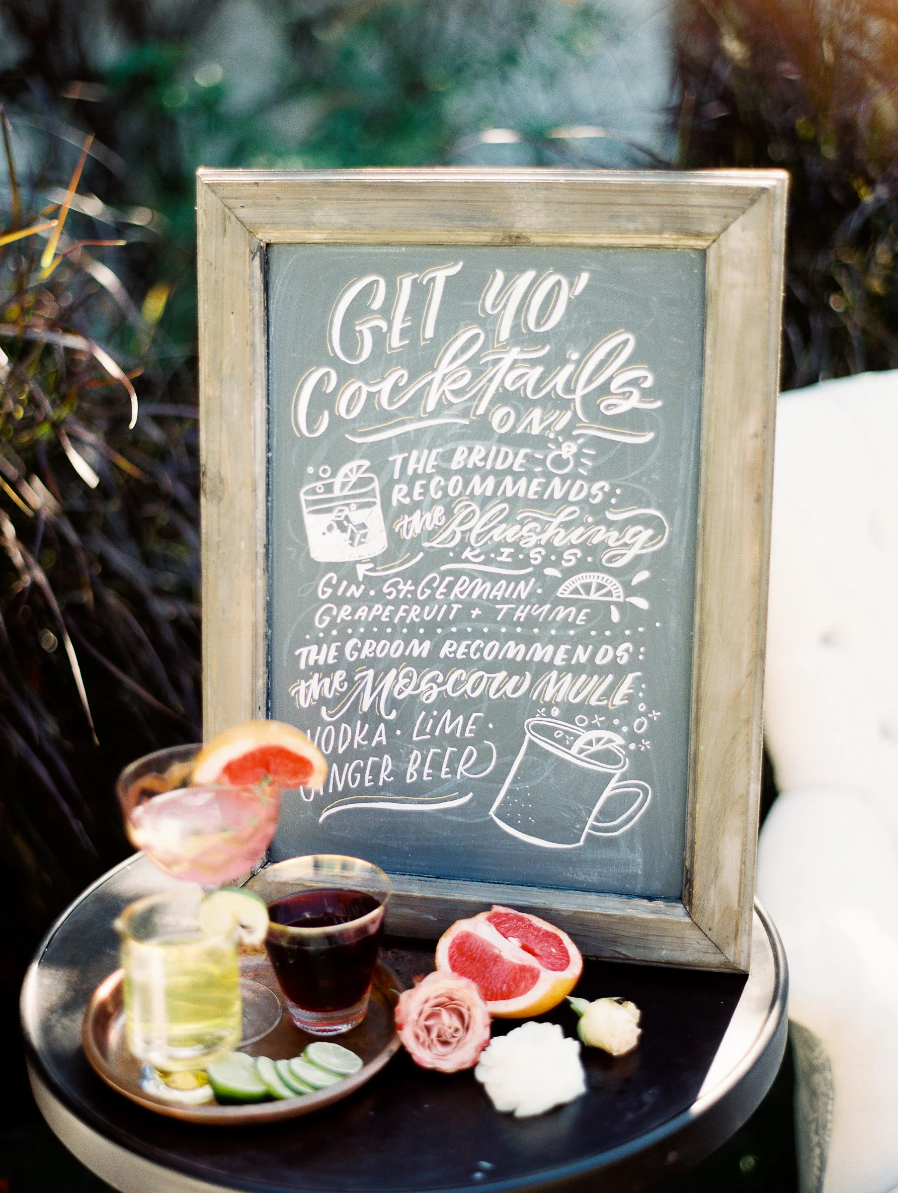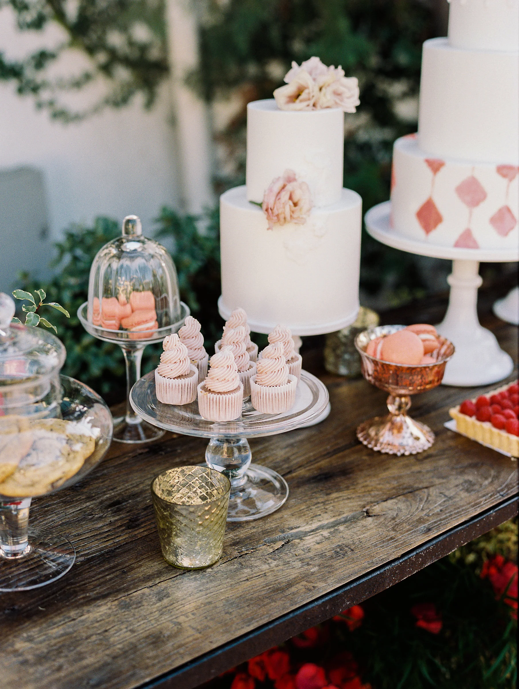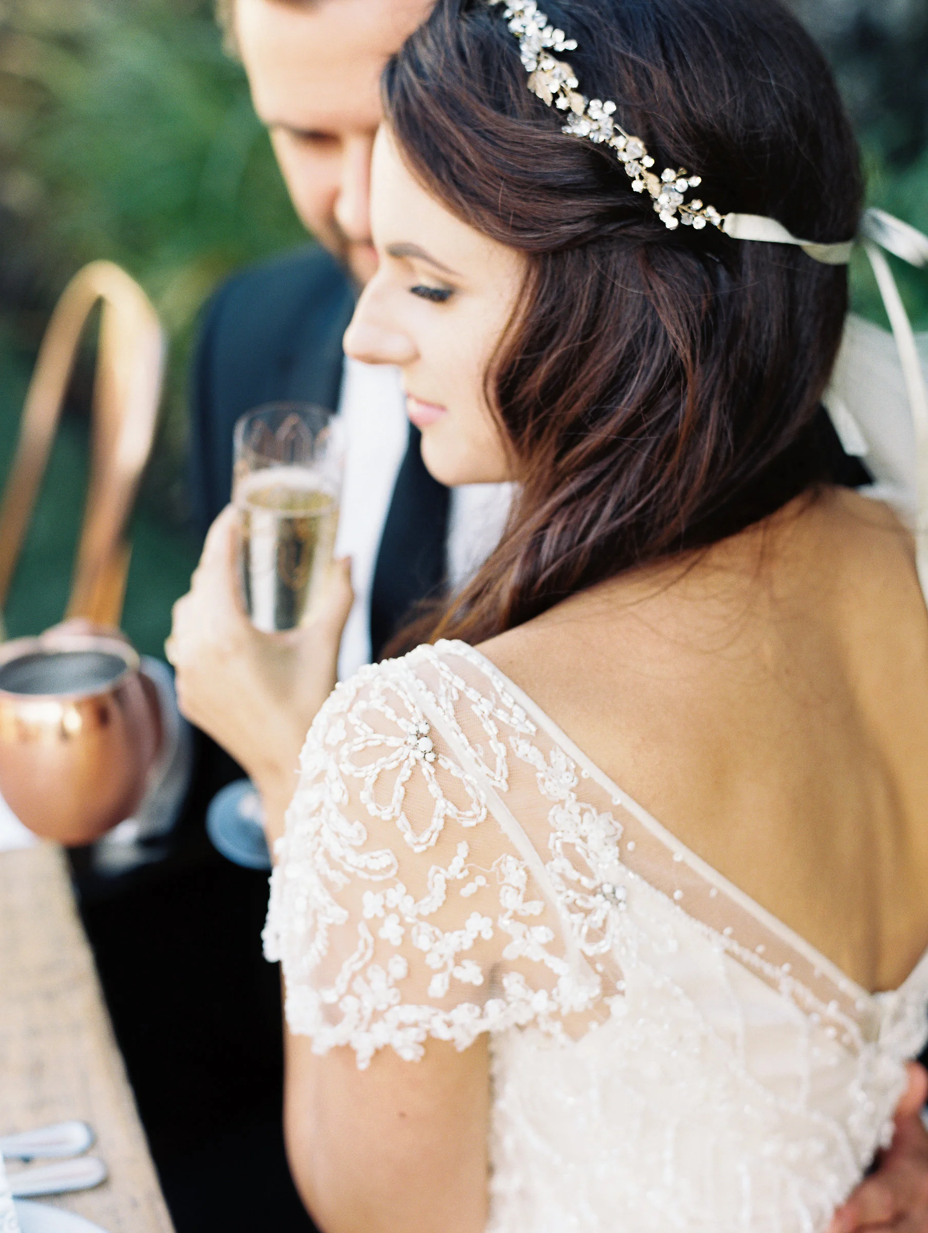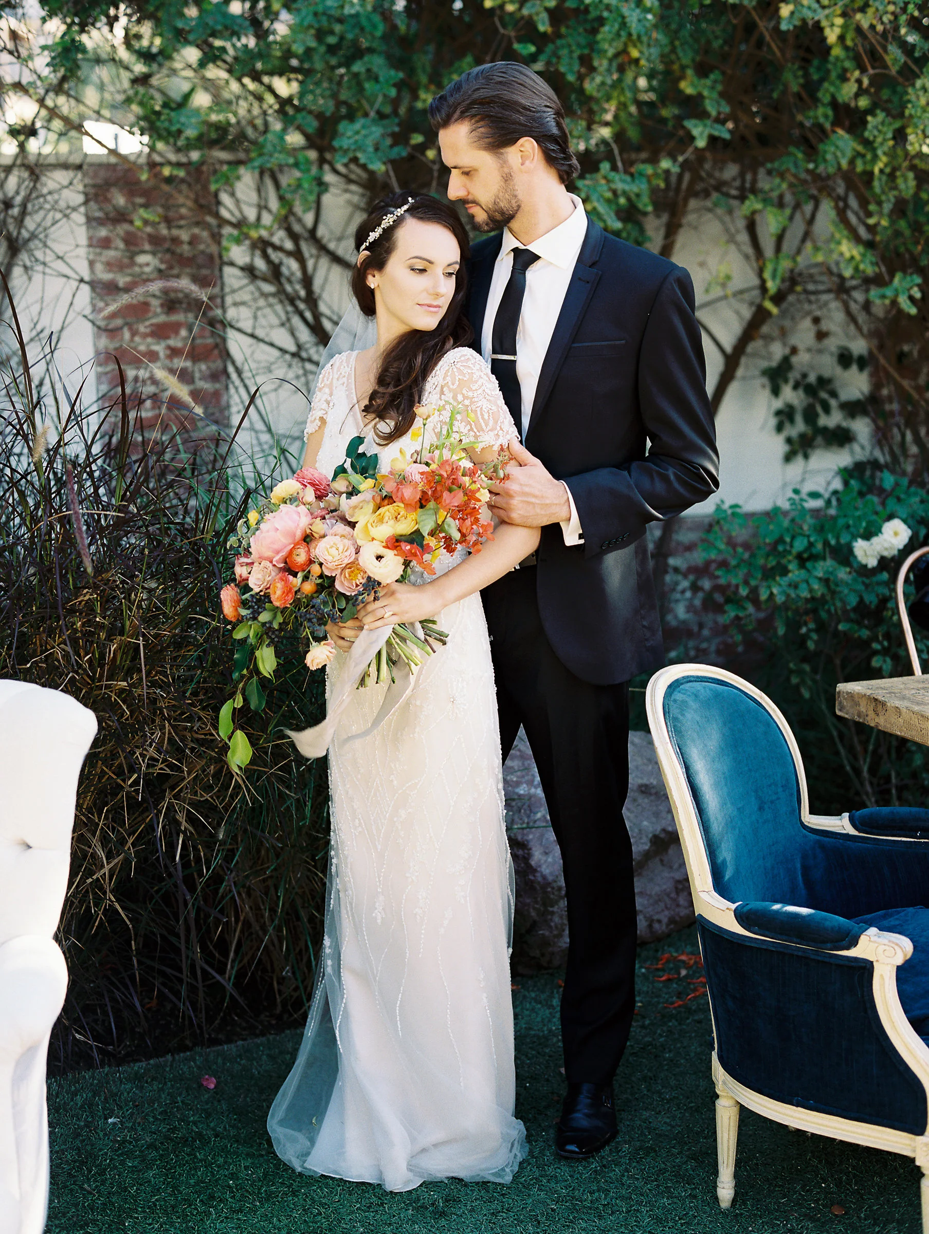 We started with rentals from Found Vintage Rentals and when we saw these metal copper chairs we had to have them. Amy Osaba brought a touch of straight up magic with her gorgeous florals and styling of the fruit spread on the table. Anthropologie champagne glasses gave a perfect touch of gold. Molly Jacques calligraphed a beautiful set of invitation suites and menus and stamps from Verde Studios accented those perfectly. Our gorgeous models wore BHLDN gowns, Susie Saltzman rings and were dolled up by Melissa of Blush by M Marie. Cakes by M Cakes Sweets made the sweet dessert bar even sweeter, and the Casino San Clemente was the backdrop for our workshop and the shoot.