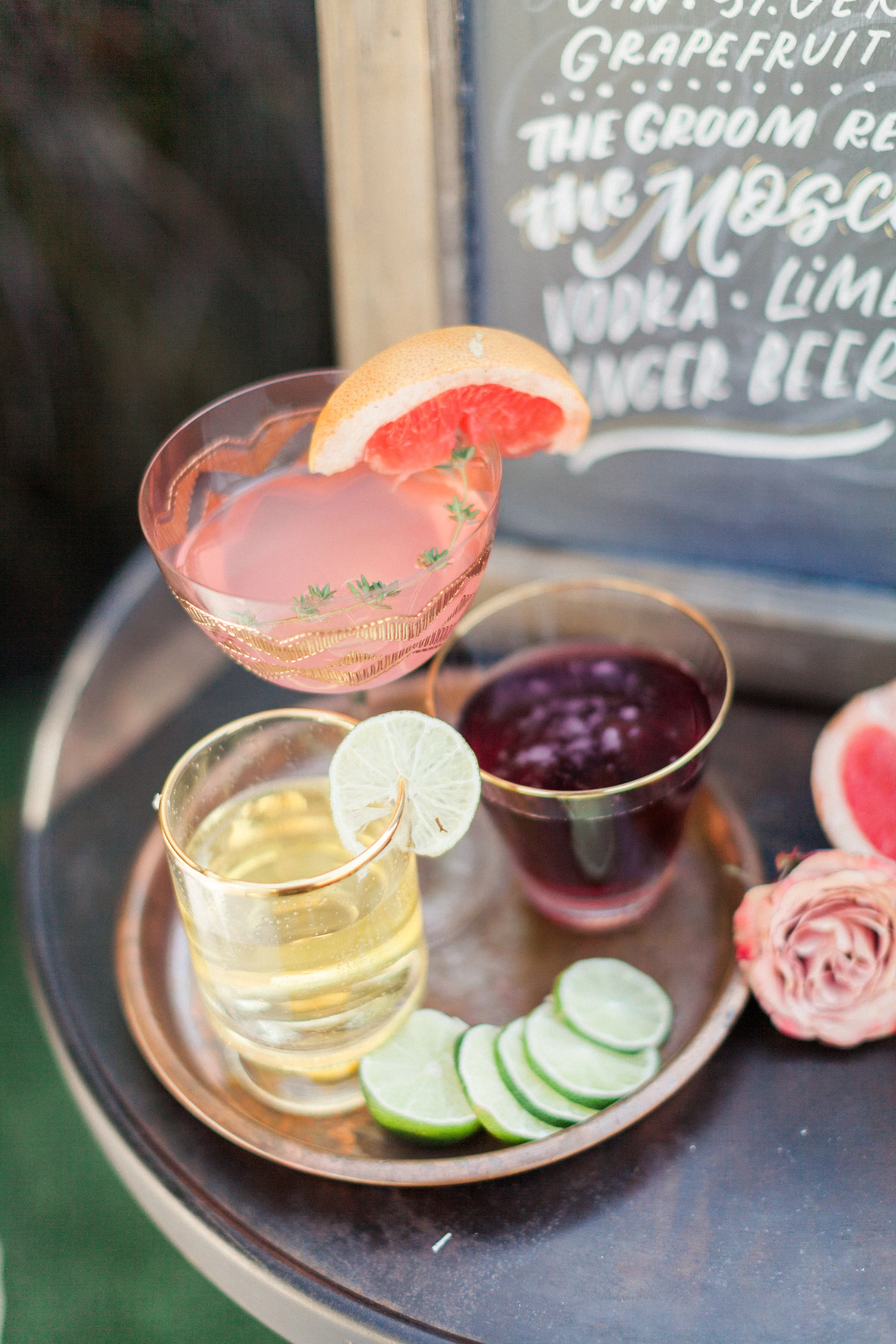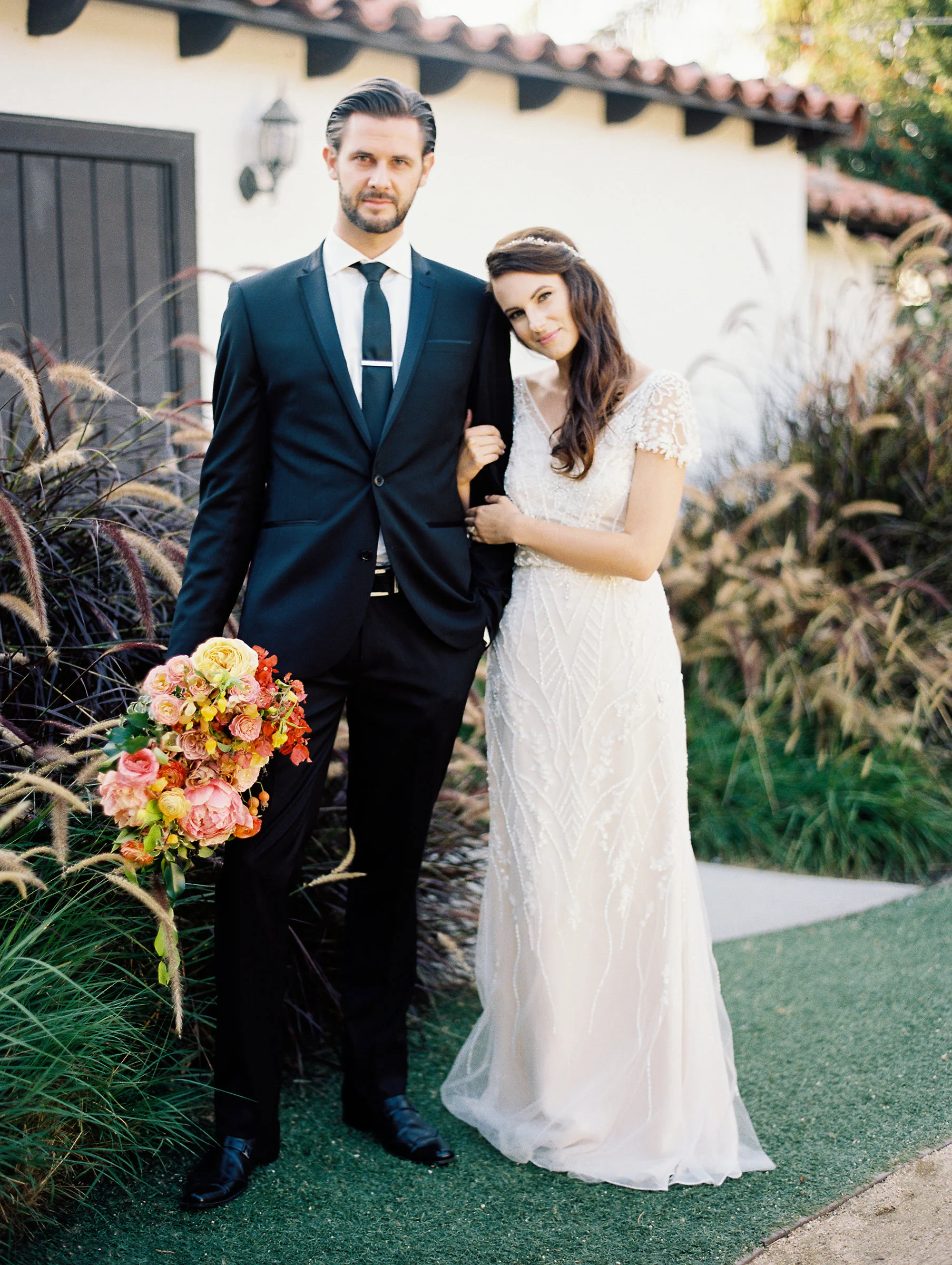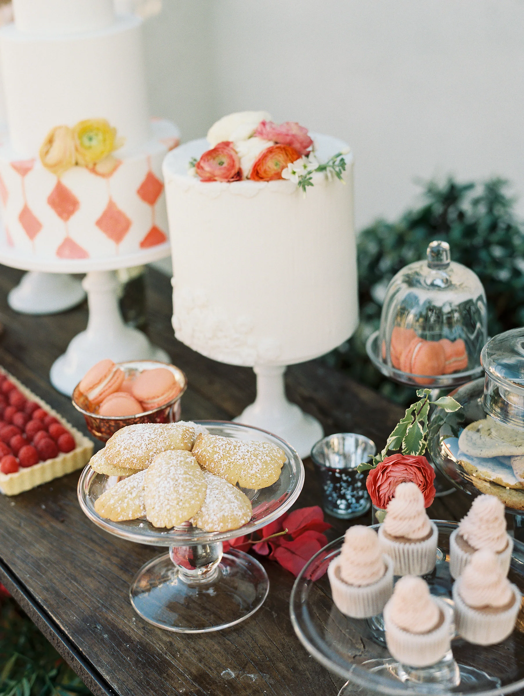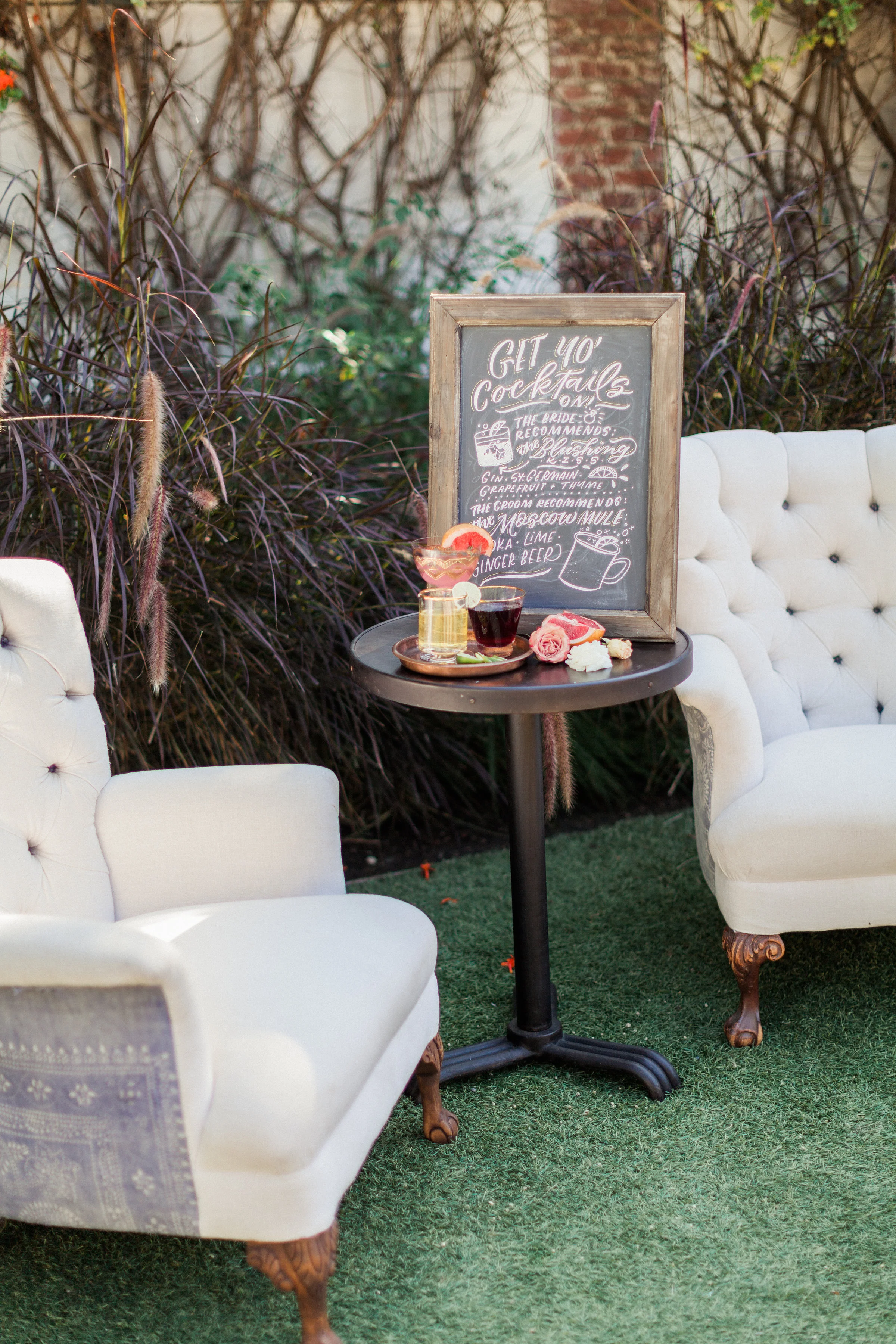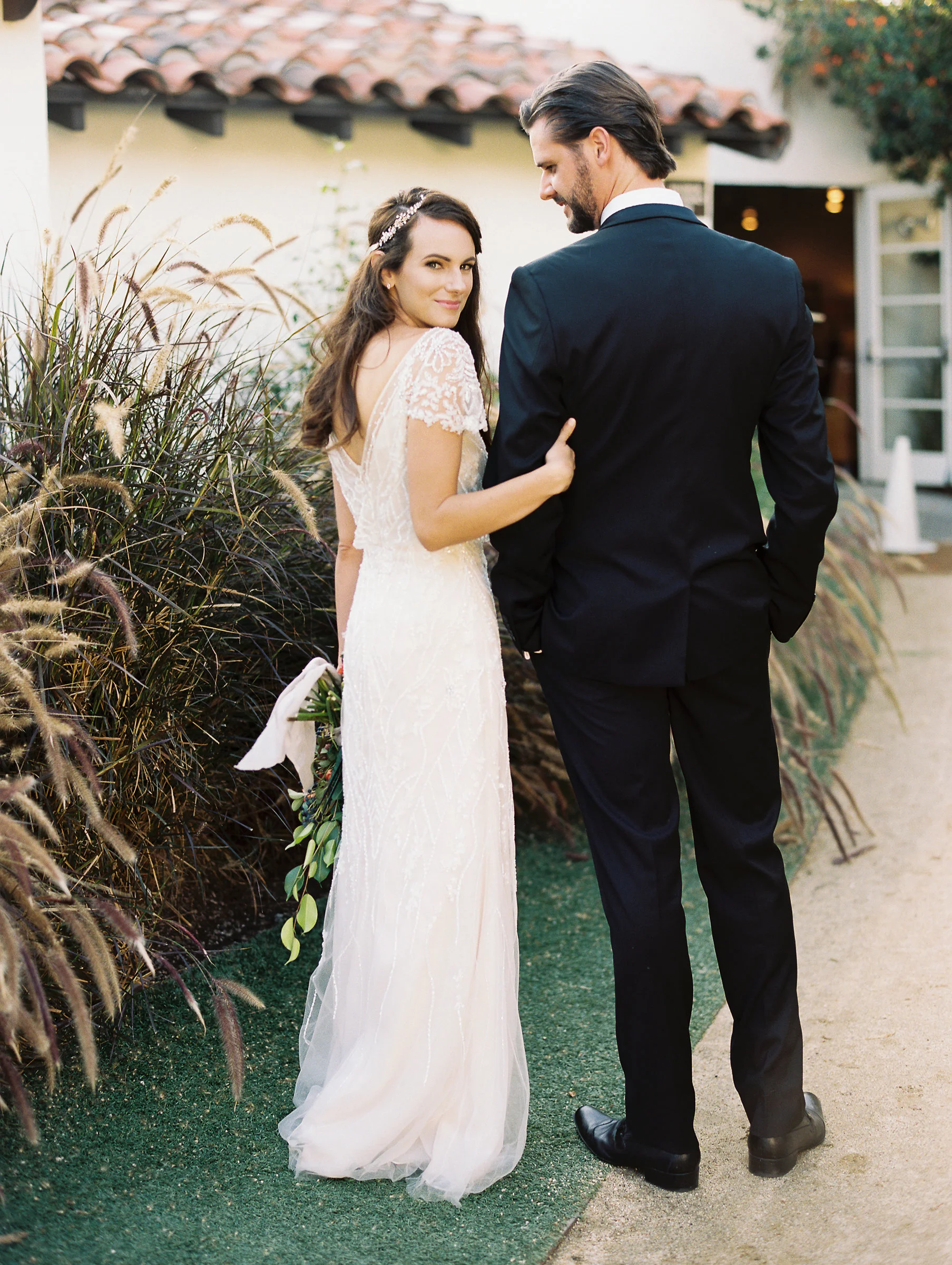 We started with rentals from Found Vintage Rentals and when we saw these metal copper chairs we had to have them. Amy Osaba brought a touch of straight up magic with her gorgeous florals and styling of the fruit spread on the table. Anthropologie champagne glasses gave a perfect touch of gold. Molly Jacques calligraphed a beautiful set of invitation suites and menus and stamps from Verde Studios accented those perfectly. Our gorgeous models wore BHLDN gowns, Susie Saltzman rings and were dolled up by Melissa of Blush by M Marie. Cakes by M Cakes Sweets made the sweet dessert bar even sweeter, and the Casino San Clemente was the backdrop for our workshop and the shoot.