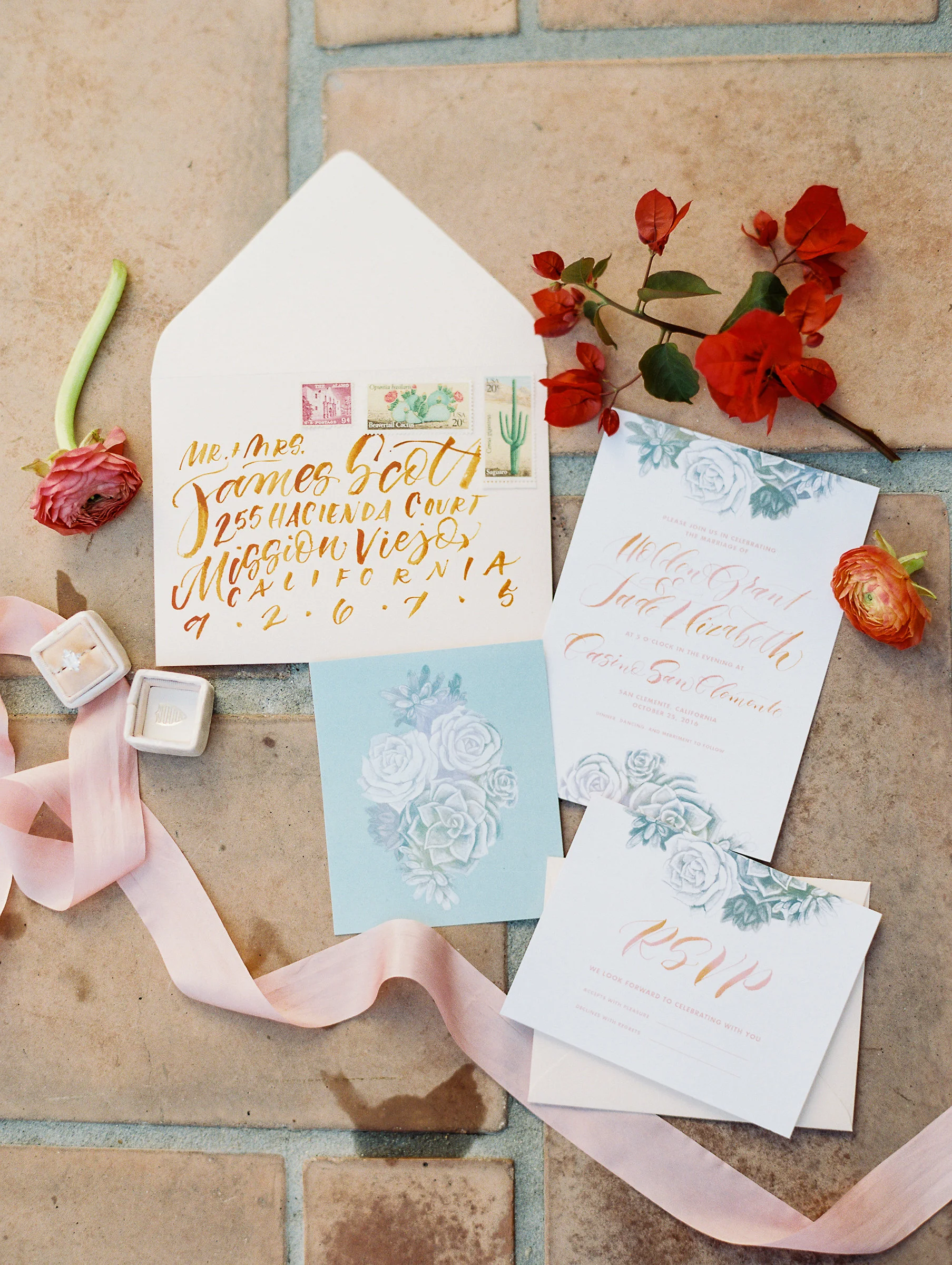 Photography: Ashley Slater | Event Styling: Michaela Noelle Designs | Floral Design: Amy Osaba | Wedding Dress: BHLDN | Invitations: Molly Jacques Illustration | Ring: Susie Saltzman | Hair + Makeup: Blush By M Marie | Venue: Casino San Clemente | Coasters: LandiDesigns | Dessert: M Cakes Sweets | Rentals & Furniture: Found Vintage Rentals | Stamps: Verde Studio | Workshop: The Bloom Workshop