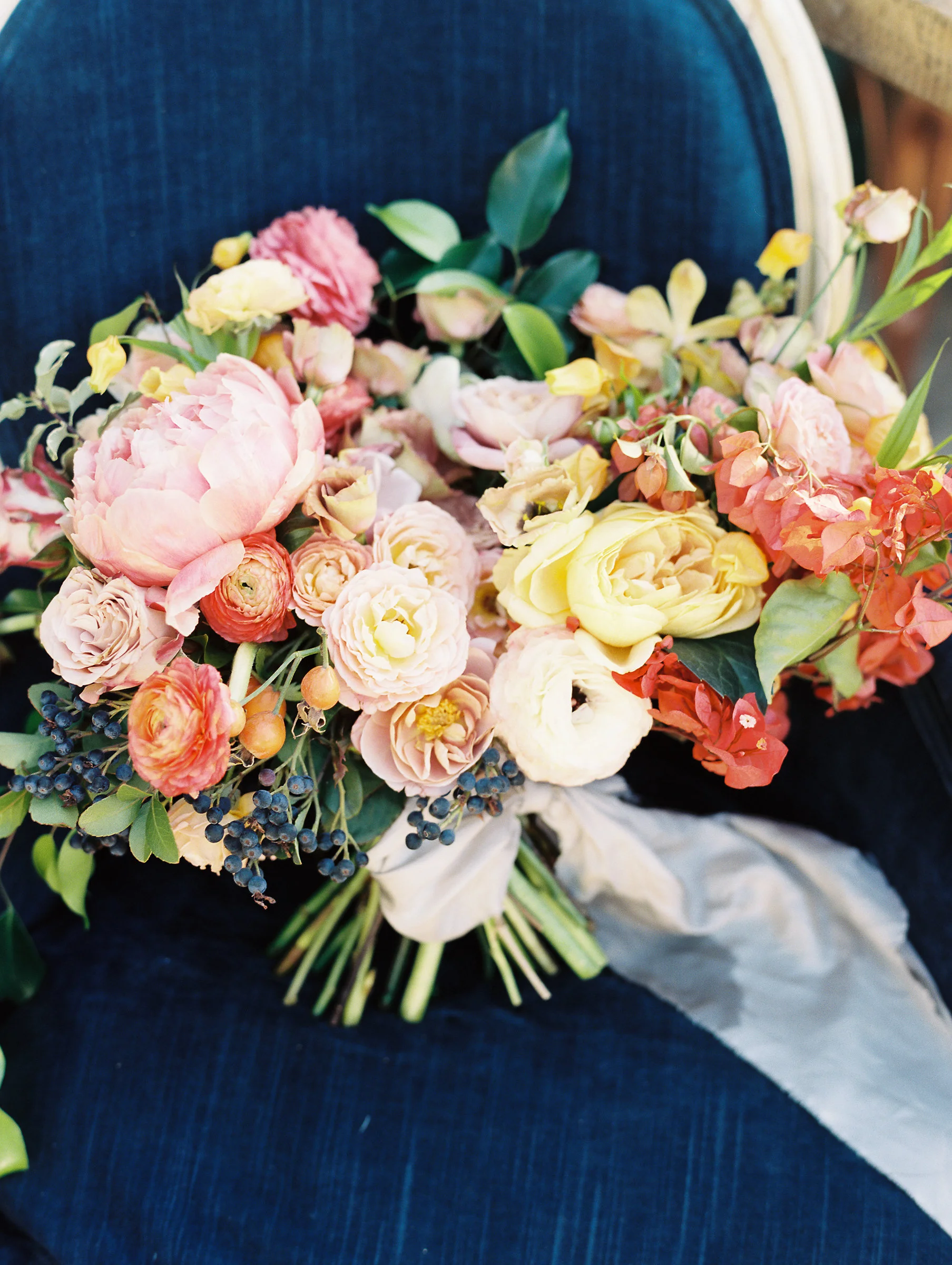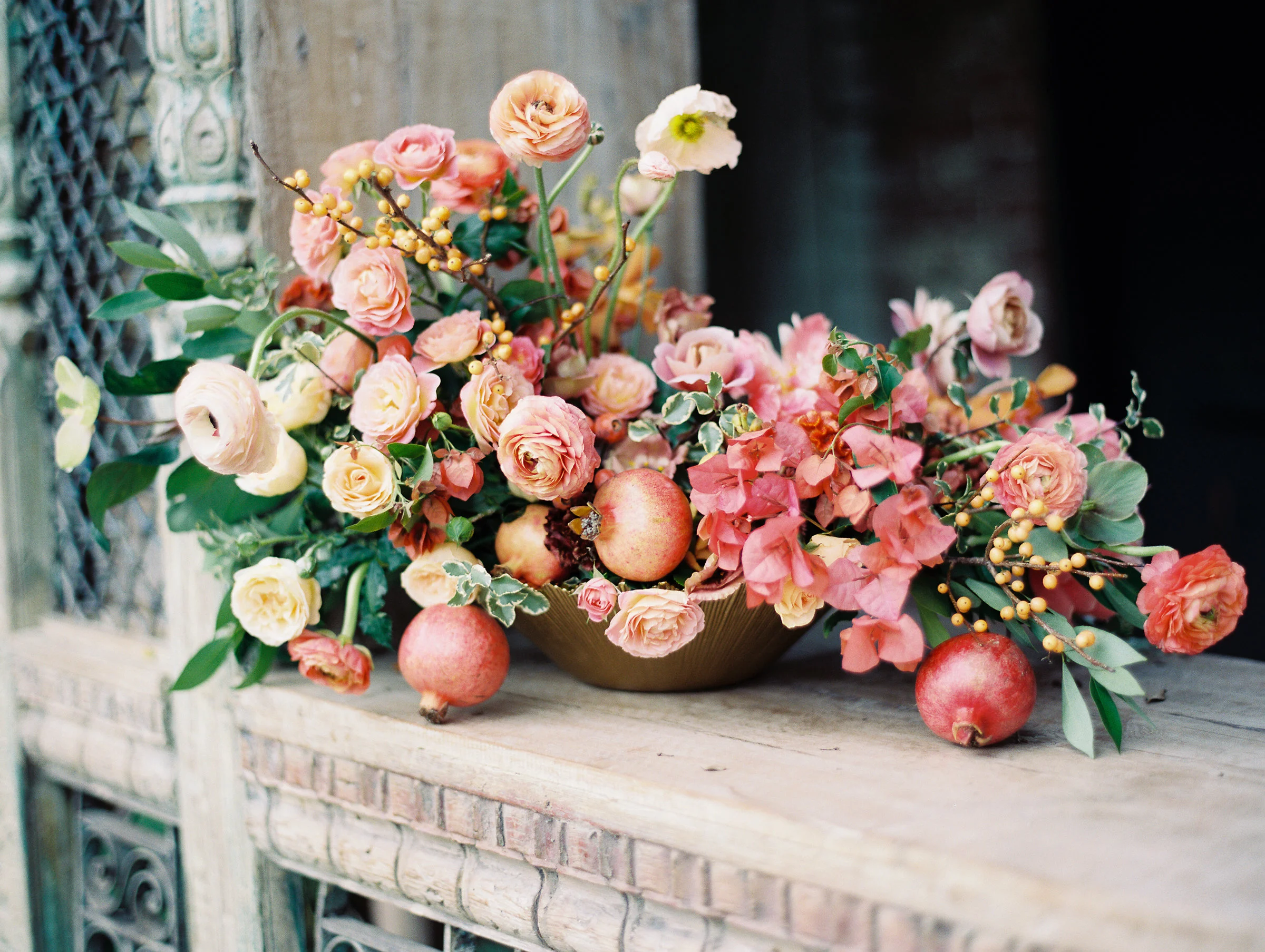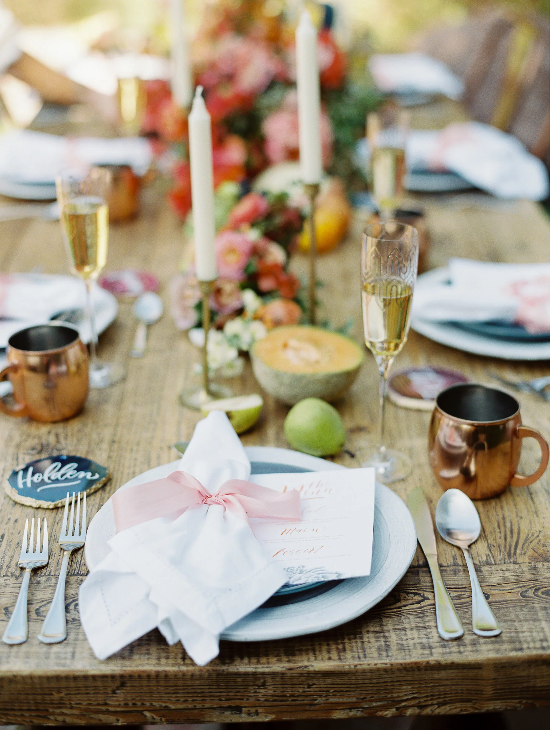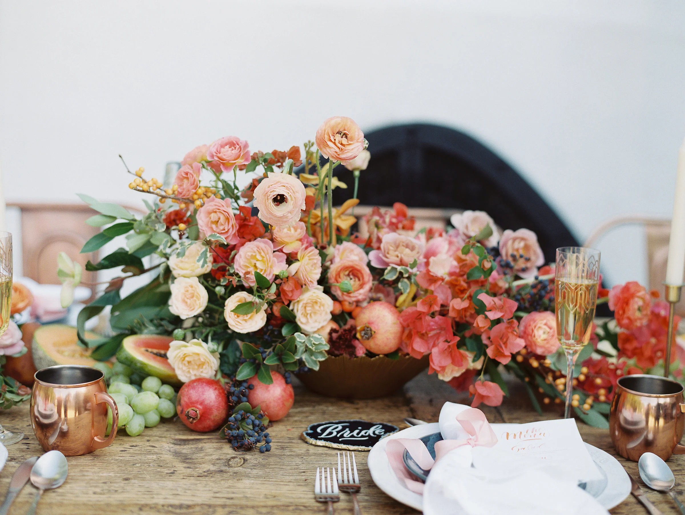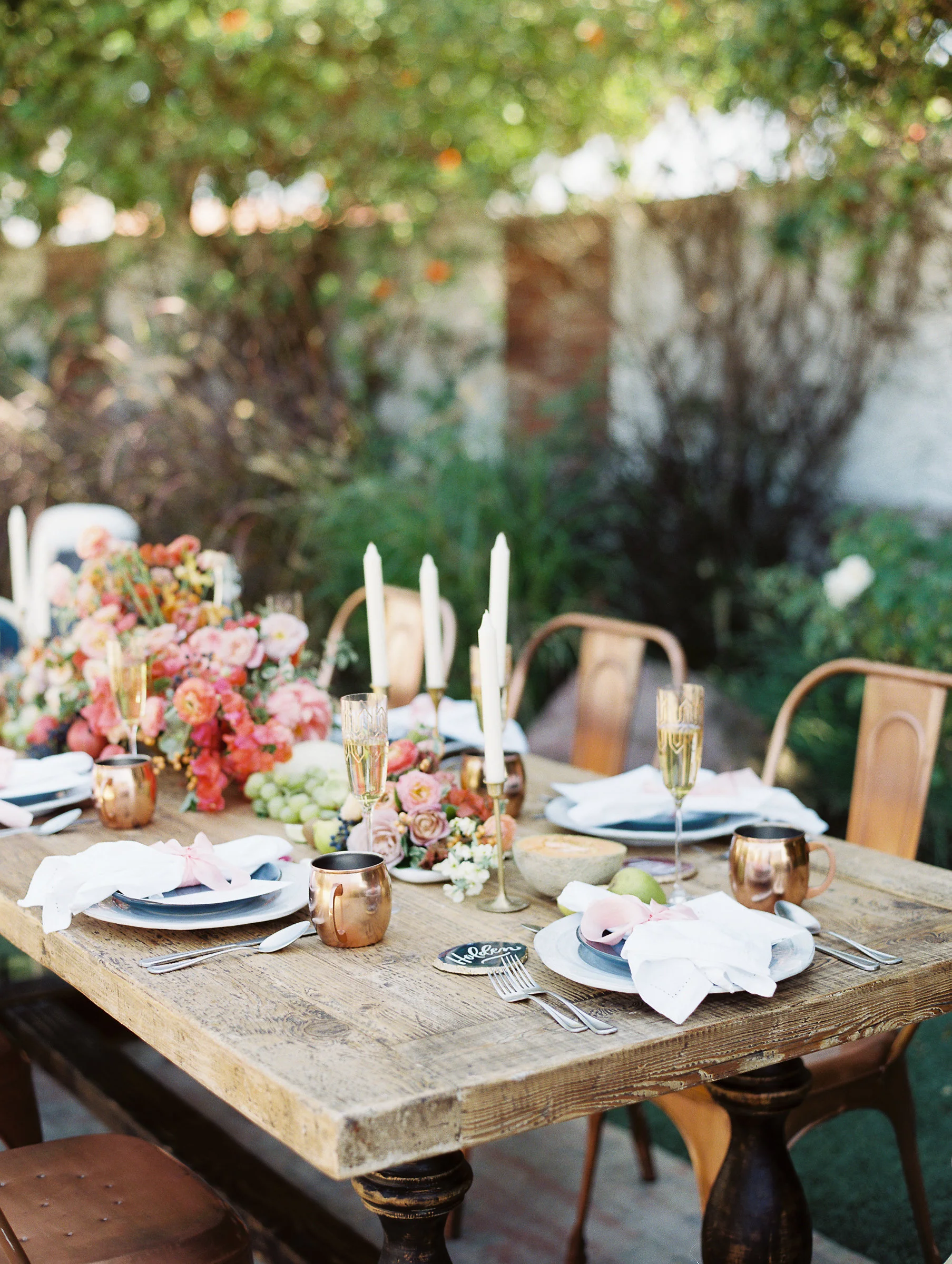 You guys. THIS. This shoot that was a part of our Bloom Bash Workshop last fall in San Clemente, California has me all kinds of excited. While I love soft, pastel or neutral palettes I was SO inspired by this colorful and vibrant vignette we created. The copper paired with the salmon, navy and gold was just too good and Style Me Pretty even shared it here!
